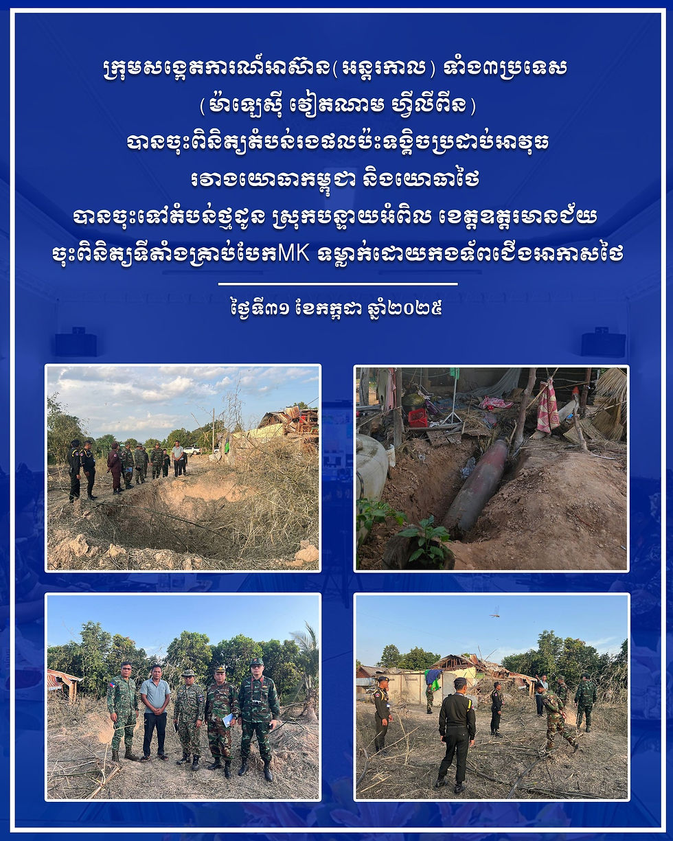 The ASEAN (Interim) Observer Group from the three countries inspected the area affected by the armed conflict between the Cambodian and Thai military. They went to the Thmor Daun area, Banteay Ampil district, Oddar Meanchey province, to inspect the location of MK bombs dropped by the Thai Air Force.